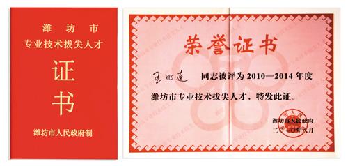 近日,公司董事长兼总经理王兆连被潍坊市人民政府评为2010-2014年度潍坊市专业技术拔尖人才。